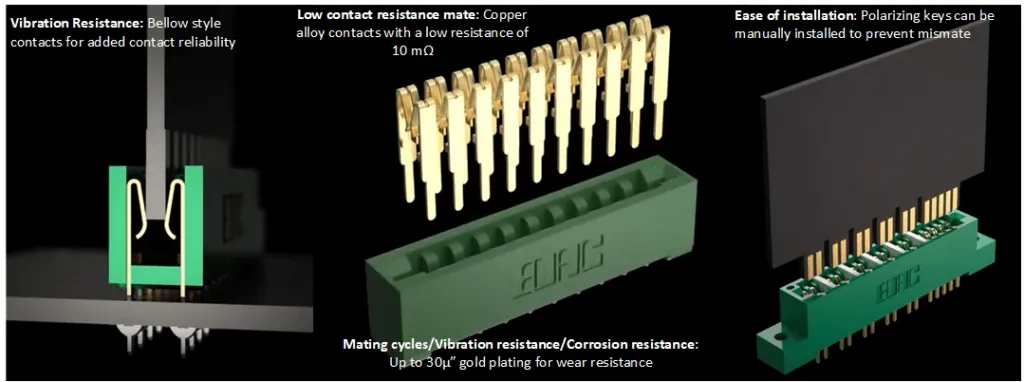 图 2.卡边缘连接器采用波纹管式触头,具有抗振性,铜合金触头具有低电阻,镀金具有耐磨性。(图片:ConnectorSupplier)